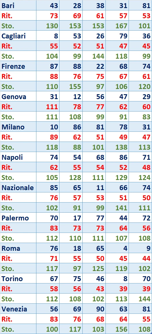 Per ogni ruota del Lotto, elenchiamo i cinque numeri che hanno accumulato il maggior numero di estrazioni senza apparire. Questi dati sono presentati con due indicatori cruciali per ogni numero: