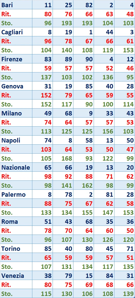 Per ogni ruota del Lotto, elenchiamo i cinque numeri che hanno accumulato il maggior numero di estrazioni senza apparire. Questi dati sono presentati con due indicatori cruciali per ogni numero: