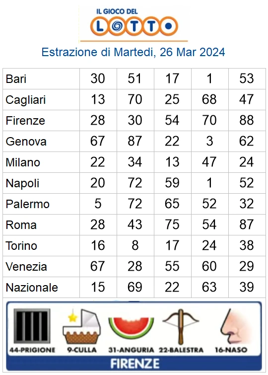 I risultati delle estrazioni comprendono tutte e 10 le ruote ed ora, in più, c’è quella della Nazionale, che non partecipa alla sorte a “Tutte”.