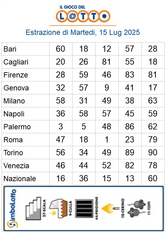Ogni estrazione del Lotto prevede la selezione di cinque numeri per ciascuna delle 10 ruote, inclusa la ruota Nazionale, che non partecipa alla sorte “Tutte”.